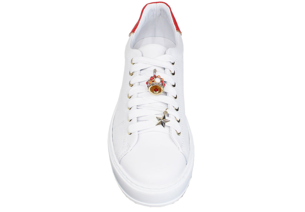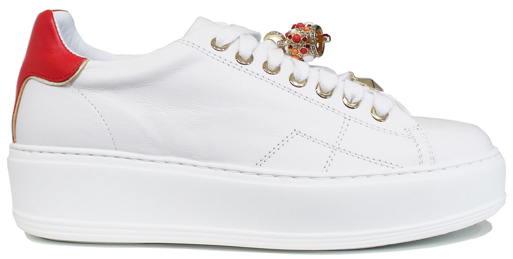 Sneaker donna artigianale, modello NEW MARINA CGIB, realizzata in vera pelle bianca, molto morbida, con riporto in pelle rossa e un bellissimo accessorio a forma di campana ricoperto di pietre brillanti