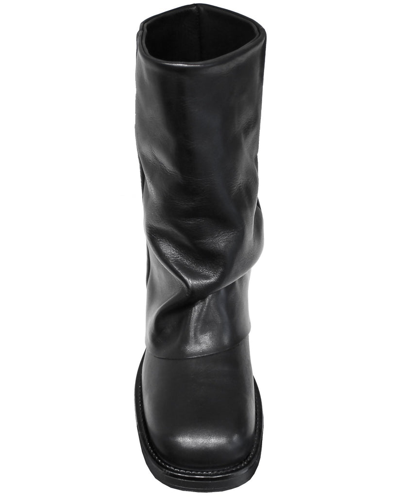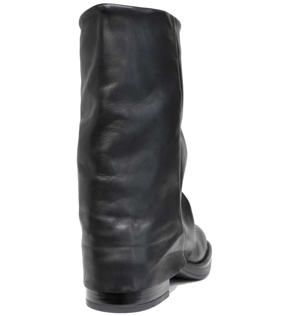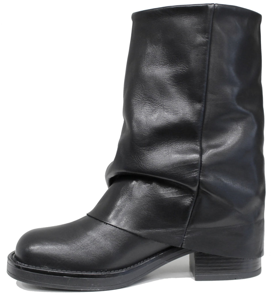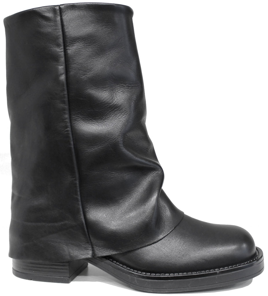 Uno dei modelli più di tendenza per questa stagione, questo stivaletto in vera pelle nera dalla particolare tomaia "risvoltata" che riveste l'intero gambale, coprendo il comodo tacco largo nascosto sotto al pellame