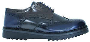 Stupenda francesina derby uomo ACS CALZATURE ITALIANE con coda di rondine, modello 022, in vera pelle lucida abrasivata a contrasto blu, grigio e testa di moro, con una bellissima suola stile zeppa che la rende da un lato elegante dall'altro sportiva; un modello che non può assolutamente mancare nella collezione di un uomo!