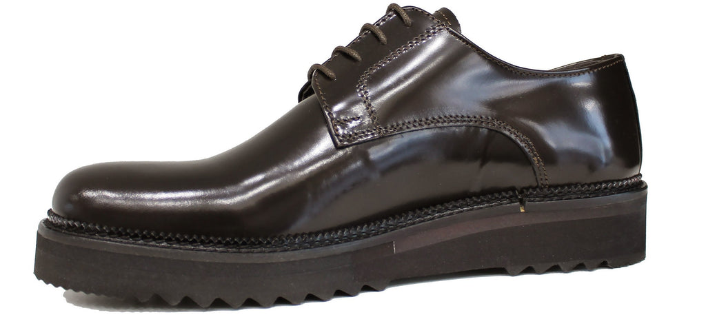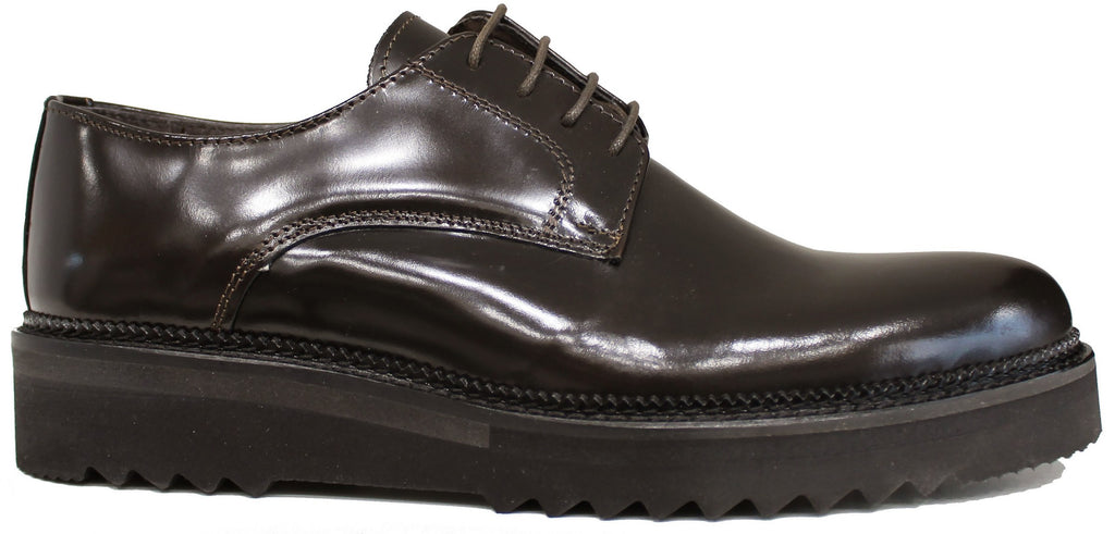 Stupenda francesina derby liscia uomo ACS CALZATURE ITALIANE, modello 301L, in vera pelle lucida abrasivata color testa di moro con una bellissima suola stile zeppa che la rende da un lato elegante dall'altro sportiva; un modello che non può assolutamente mancare nella collezione di un uomo!