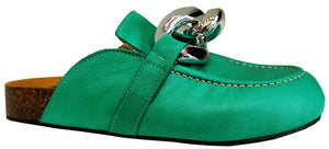 Stupendo sabot CROWN donna, articolo JW SABOT, con punta rotonda, accessorio una catena oversize argento e il pellame morbidissimo è color verde; un articolo pratico, versatile ed elegante che non può assolutamente mancare nella collezione di una donna!