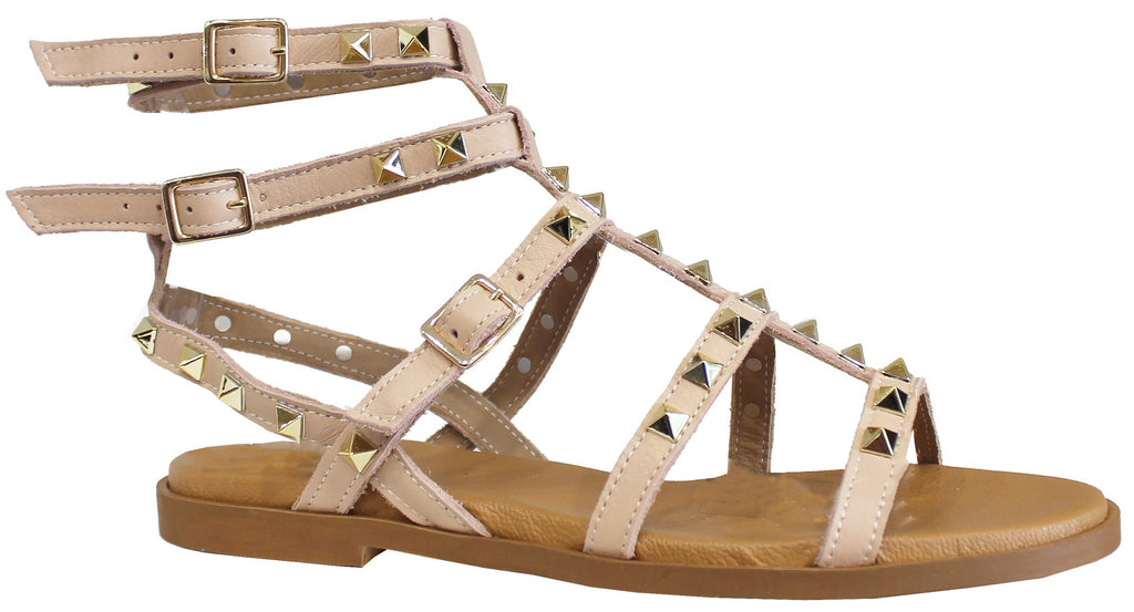 Stupendo sandalo basso CROWN interamente borchiato in vera pelle color ecrù, modello CLEOPATRA PIRAMIDI, dalla suola imbottita molto morbida e con il doppio cinturino a caviglia con borchie oro platino, è un articolo elegante che non può assolutamente mancare nella collezione di una donna!
