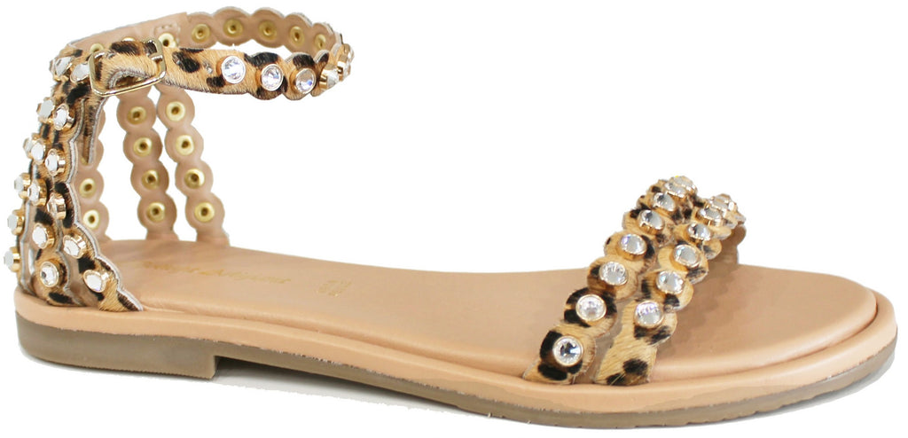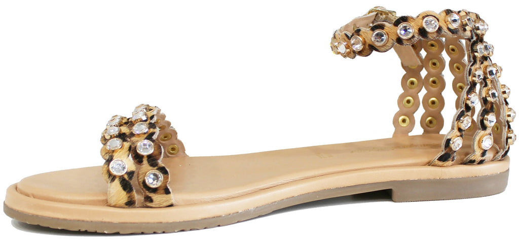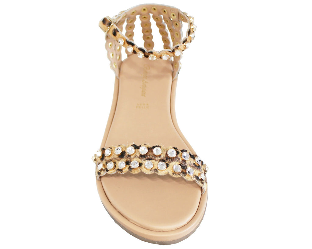 Bellissimo sandalo basso interamente strassato, modello 1810, in cavallino beige leopardato con borchie color cristallo sia sul cinturino a caviglia che nel toppone posteriore; è un articolo pratico e allo stesso tempo elegante che non può assolutamente mancare nella collezione di una donna!