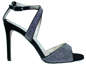 Stupendo sandalo con tacco alto a spillo ACS CALZATURE ITALIANE in vera pelle scamosciata color nero con strass argento e cinturino a incrocio sul collo, articolo M5079, dalla suola in cuoio: un articolo molto elegante che non può assolutamente mancare nella collezione di una donna!