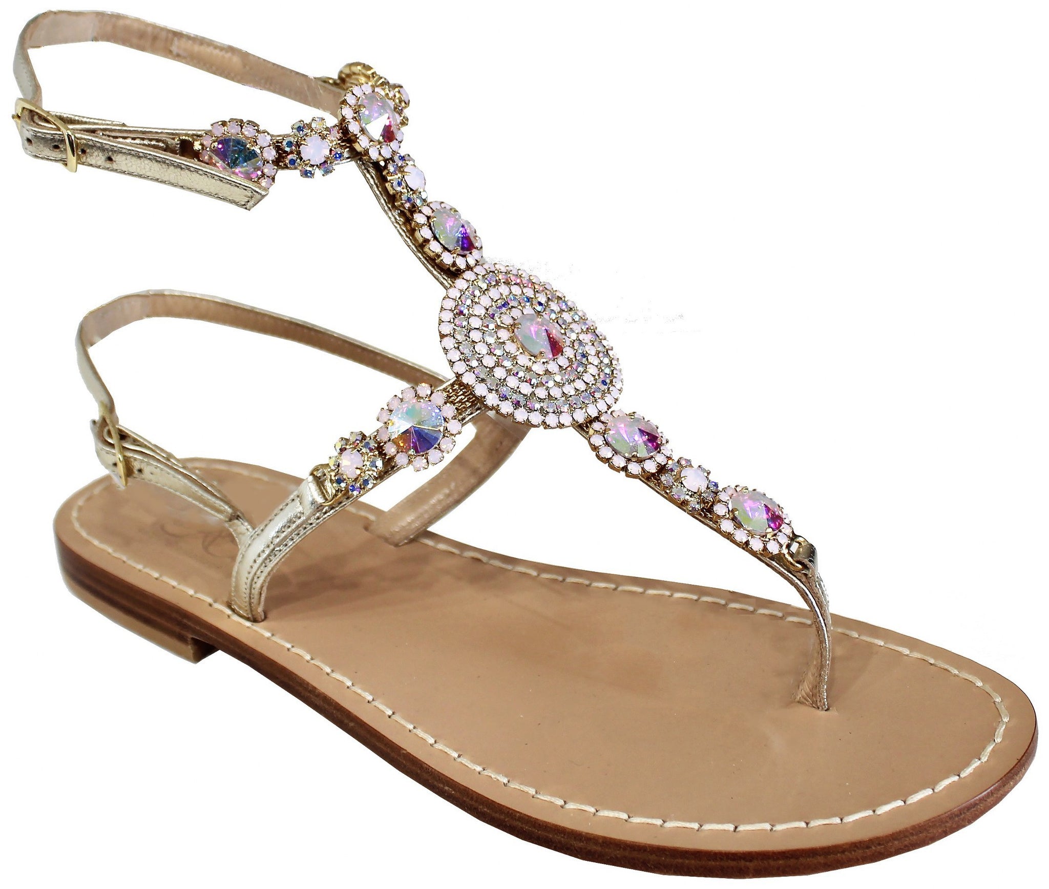 Stupendo sandalo gioiello basso, modello 1828, accessoriato con pietre di Positano platino e rosa, garanzia di assoluta qualità, luminosità e durata nel tempo!