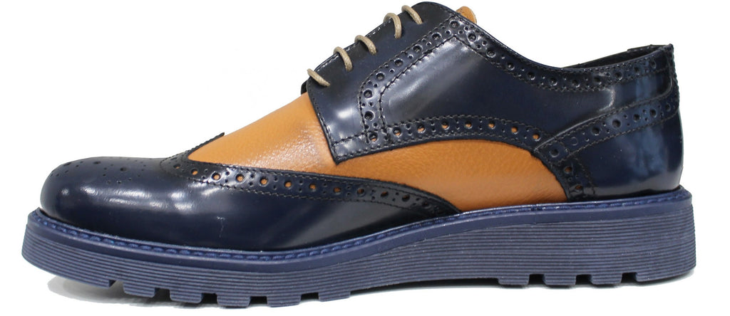 Bellissima francesina derby bicolore artigianale ricamata uomo, modello 3030, in vera pelle abrasivata lucida blu e pelle martellata color cuoio con una bellissima suola stile zeppa che la rende da un lato elegante dall'altro sportiva; un modello che non può assolutamente mancare nella collezione di un uomo!