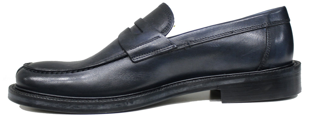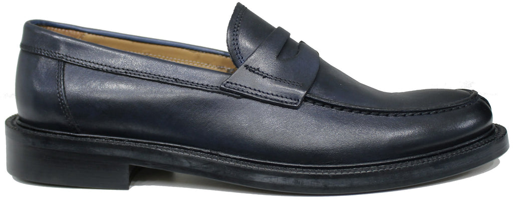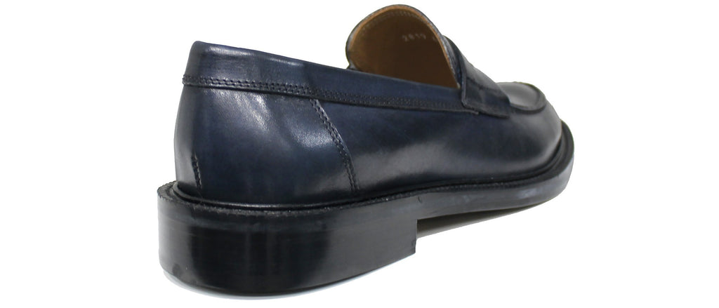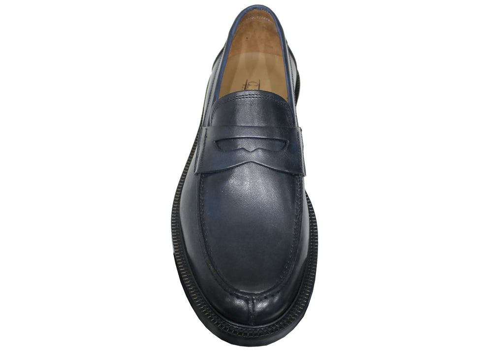 Bellissimo mocassino artigianale con bocca di leone, modello EUROPA 2819, dal pellame morbidissimo color blu, con suola in vero cuoio e mezza piantina in gomma antiscivolo che rende la scarpa di grande qualità!