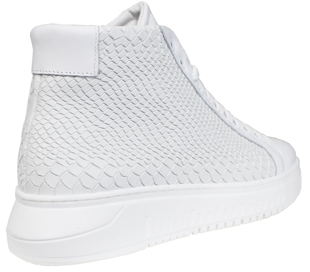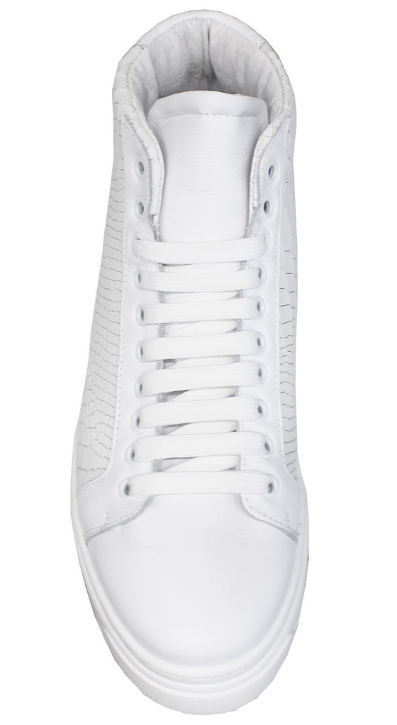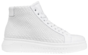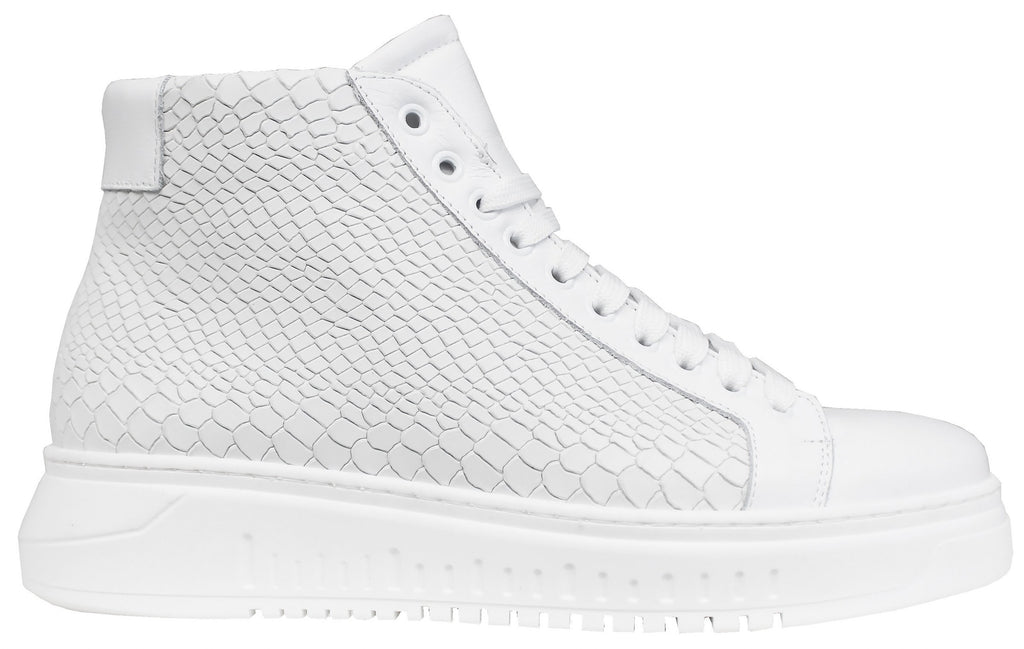 Stupenda Sneaker altezza caviglia ACS CALZATURE ITALIANE, modello AR121, in vera pelle bianca, effetto "squamata", con suola alta oversize, dal particolare stile elegante/sportivo che non può assolutamente mancare nella collezione di un uomo!