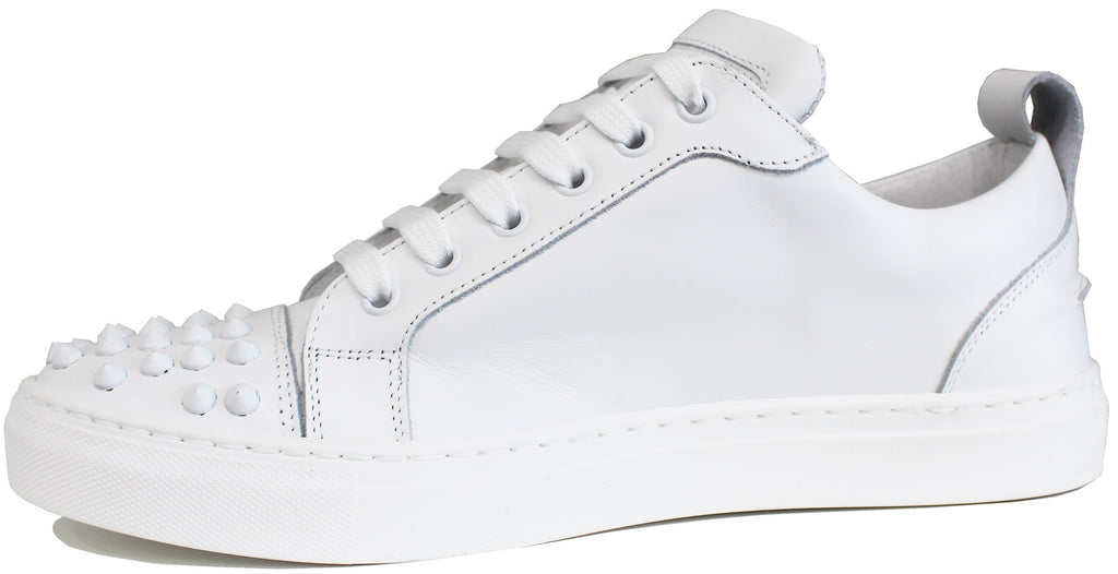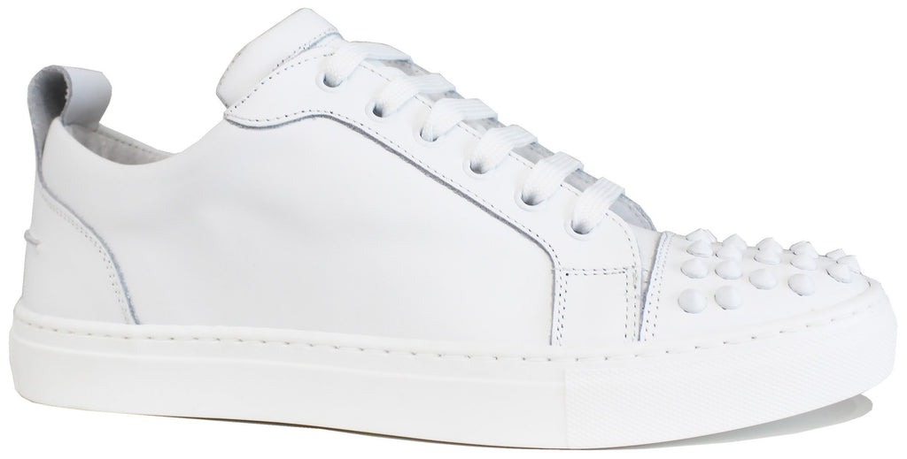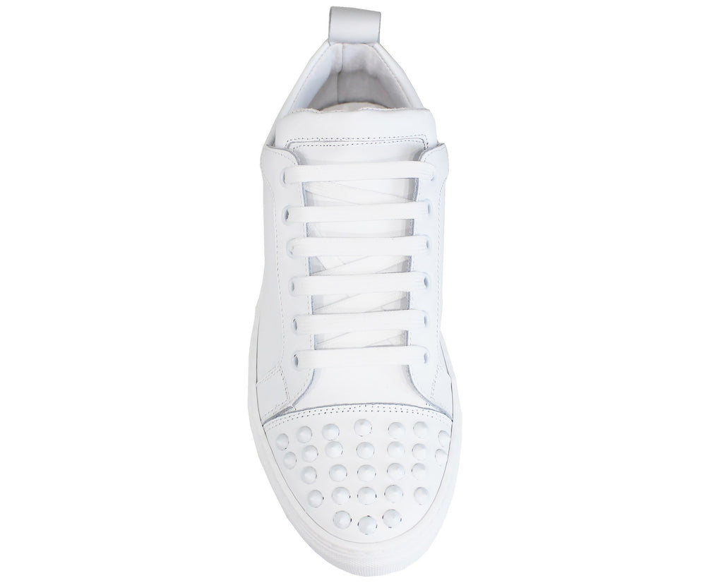 Sneaker uomo artigianale ACS CALZATURE ITALIANE, modello 71B, in vera pelle bianca con delle borchie in tinta in punta; un modello dal particolare stile elegante/sportivo che non può assolutamente mancare nella collezione di un uomo!
