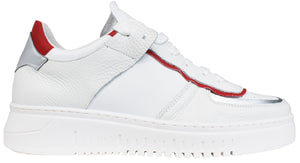 Sneaker uomo ACS CALZATURE ITALIANE, modello AR01, in vera pelle color bianco o e dettagli color specchio argento e rossi, dal particolare stile elegante/sportivo che non può assolutamente mancare nella collezione di un uomo!