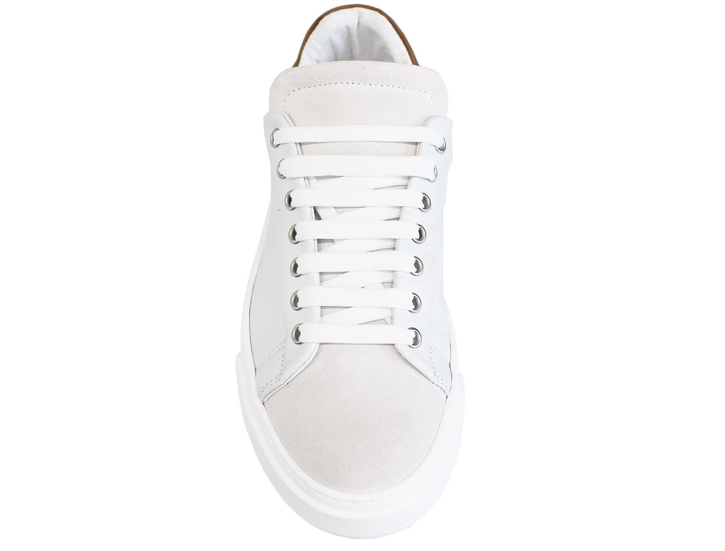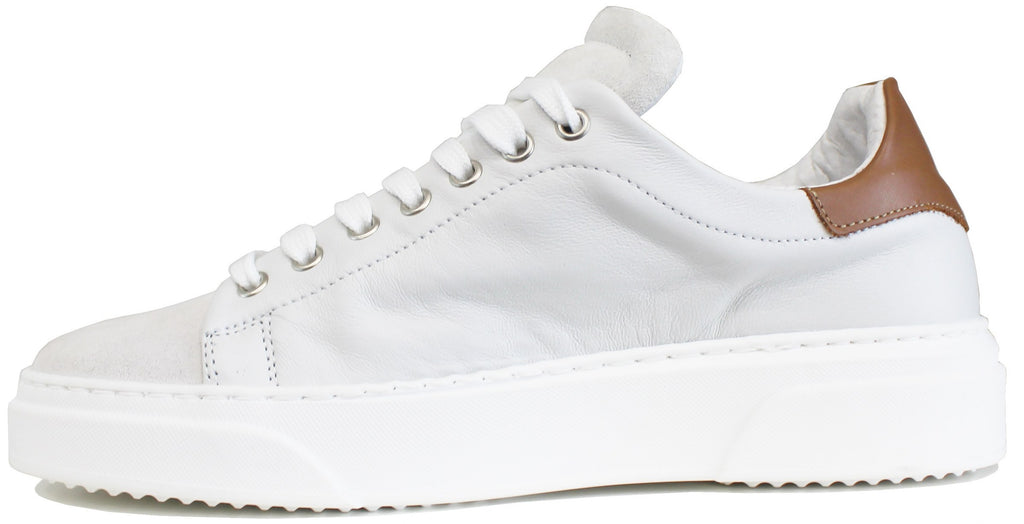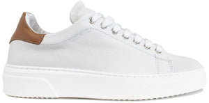 Sneaker uomo artigianale, modello AZ52, in vera pelle bianca con tallone dietro color cuoio; scarpa dal particolare stile elegante/sportivo che non può assolutamente mancare nella collezione di un uomo!