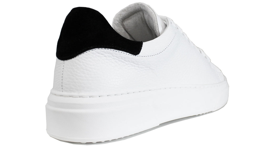 vista posteriore del tacco scarpe sneaker bassa uomo eleganti sportive articolo calzaturificio basic az52 in vera pelle bianca con tallone dietro in camoscio nero pellame molto morbido con suola alta rialzata molto leggera e comoda 100% made in italy scarpe con negozio a civitanova marche collezione moda soletta morbida estraibile per plantare calzature artigianali made in italy scarpe online spedizione veloce pagamento alla consegna