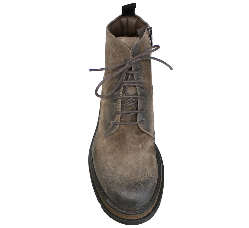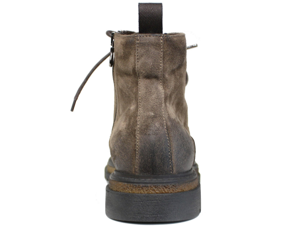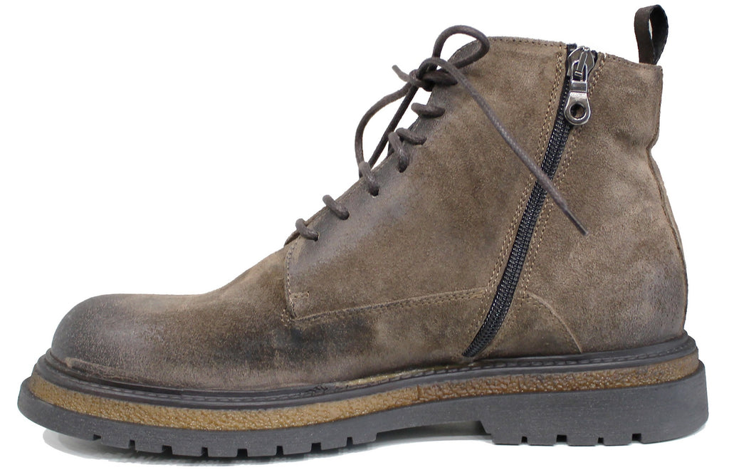 Stivaletto artigianale uomo, modello 1241, realizzato in vera pelle scamosciata ingrassata grigio tortora che, oltre a essere stringato, presenta una comoda cerniera laterale (nascosta nella parte interna) che ne facilità la calzata