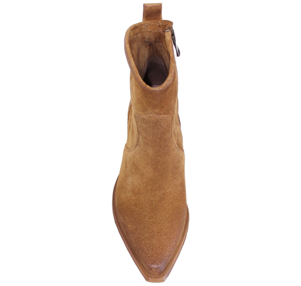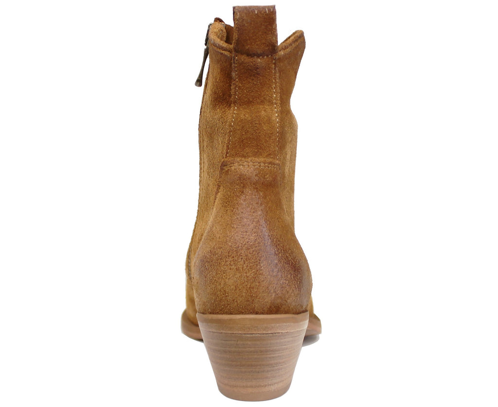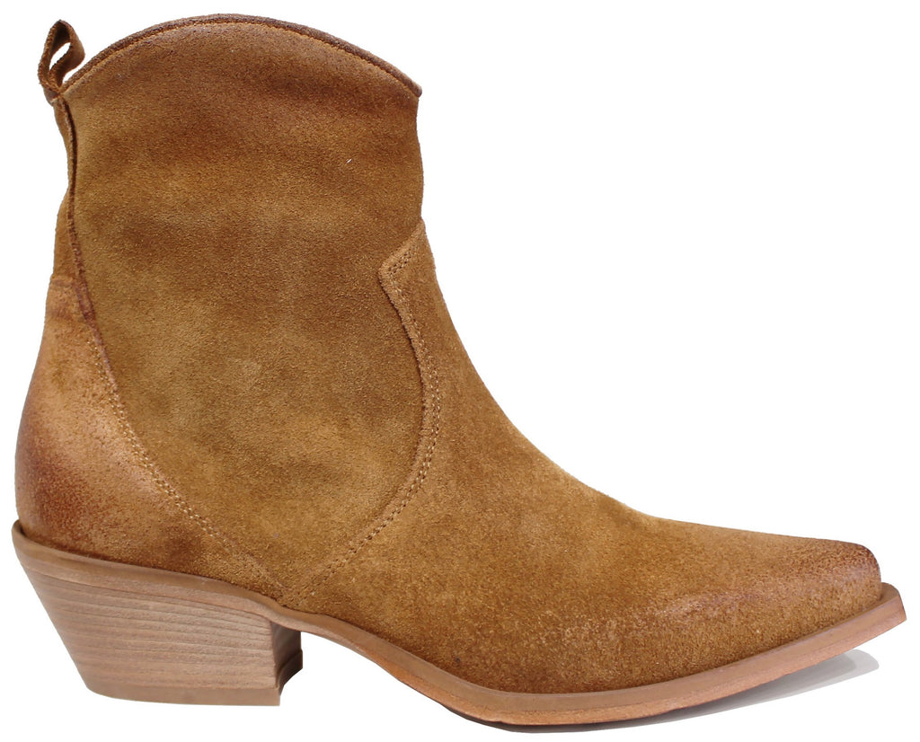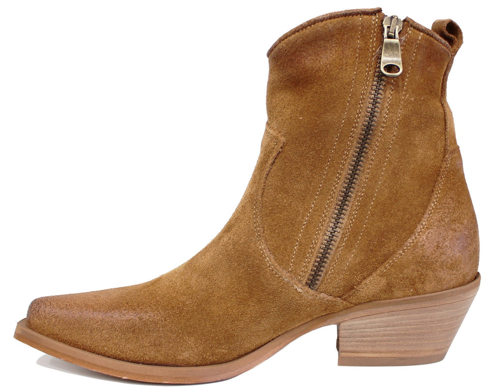 Texano donna artigianale a punta, modello DX380S, realizzato in vera pelle scamosciata cuoio, molto morbida, con cerniera laterale